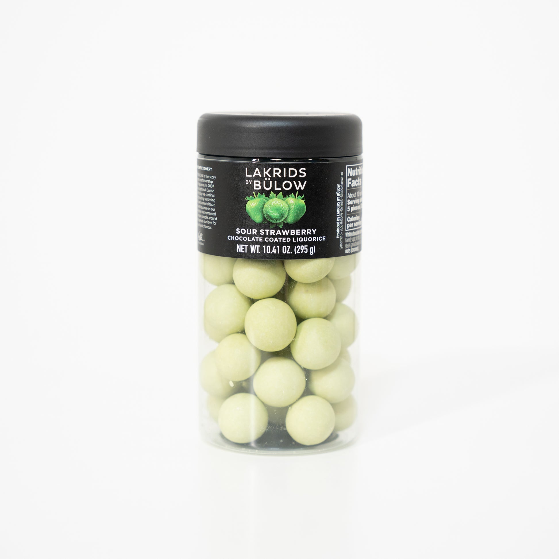 Sour Strawberry 10.4oz: Imagine freshly picked green strawberries together with exquisite red liquorice in a sweet, fruity bite. Enjoy how fresh and sour notes from crispy, green strawberries are perfectly balanced with chewy red liquorice, all swirled in silky white chocolate and a crunchy, green sugar shell for an extra sour twist.