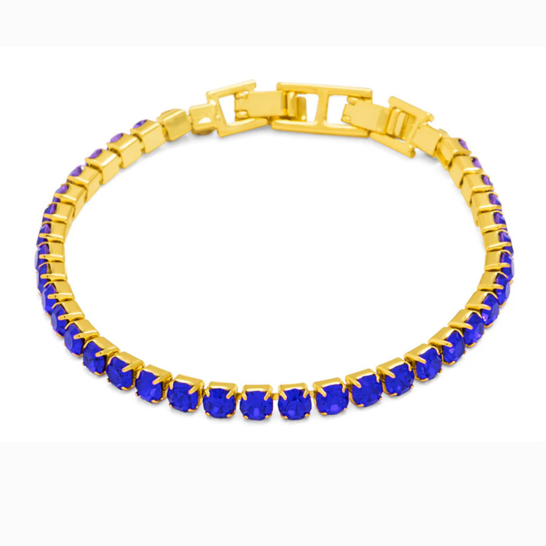 Take your style to the next level with our elegant 18K gold-plated tennis bracelet, featuring dazzling round-cut crystals and a sturdy snap closure. Made with triple plating and hypoallergenic materials, this 7" bracelet is available in four stunning colors to suit any outfit.