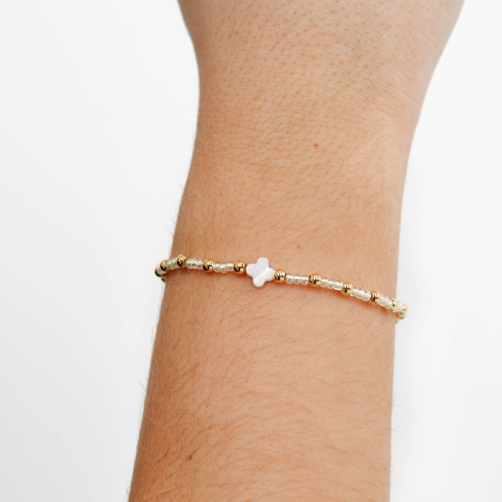 Elevate your style with a touch of elegance and luck. The Beaded Clover Bracelet is a chic blend of sophistication and symbolism- featuring a delicate clover charm surrounded by smooth, polished beads that catch the light with every movement. The stretch-fit design ensures a comfortable, secure fit, making it perfect for everyday wear or layering with your favorite stack.